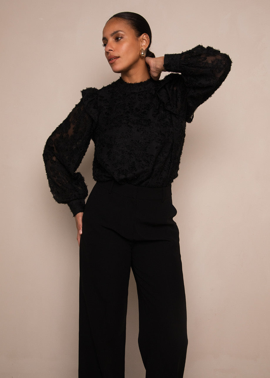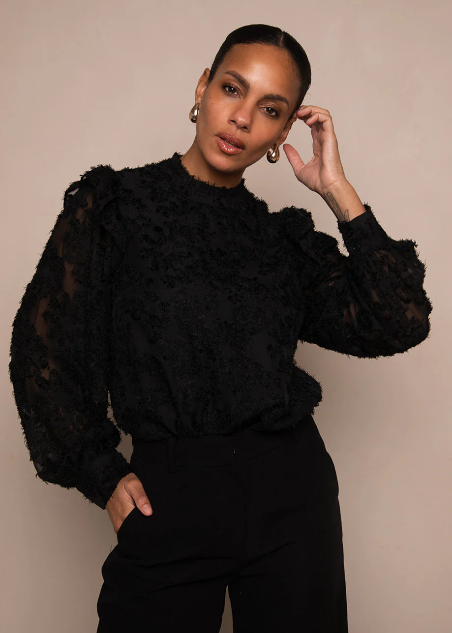 De Bambie Blouse is gemaakt van een zachte polyesterstof met subtiele haartjes, biedt deze blouse een rijke textuur en een elegante uitstraling. Het opstaande kraagje en de ruffle-details op de schouders zorgen voor een vrouwelijke, eigentijdse twist. De transparante mouwen voegen een luchtig contrast toe aan het gestructureerde lijfje.