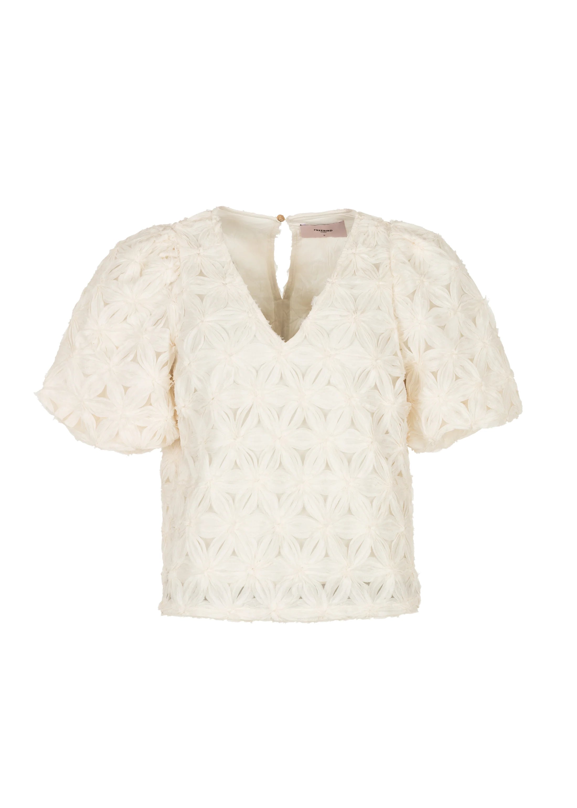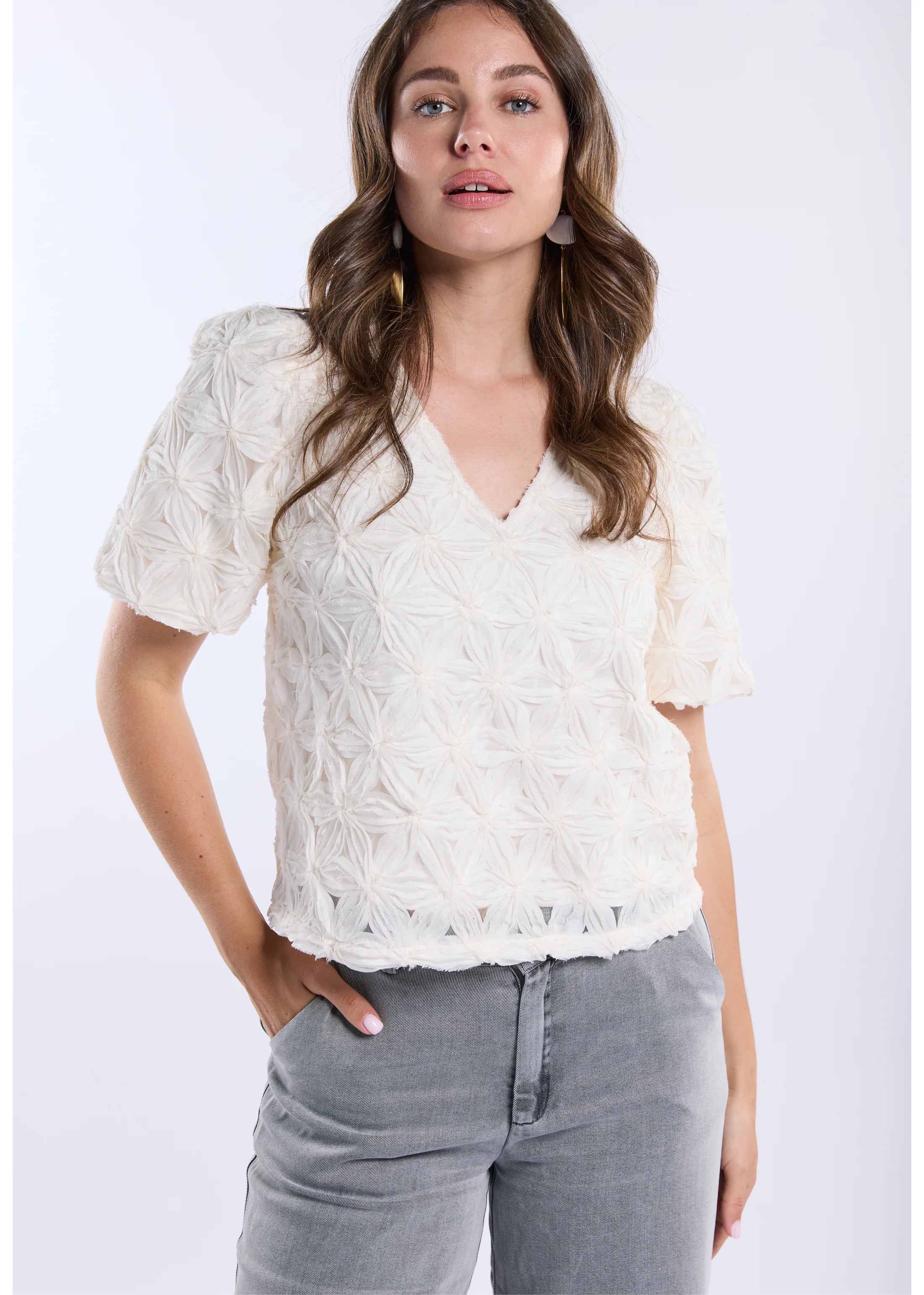 Deze bijzondere top is gemaakt van een geweven 3D-stof en is rijkelijk versierd met verfijnde bloemenapplicaties die zorgen voor een luxe en opvallende uitstraling. De elegante V-hals geeft het ontwerp een vrouwelijke touch, terwijl de korte mouwen zorgen voor een mooie balans tussen speels en chic. Perfect voor speciale gelegenheden of om een outfit net dat extra accent te geven.