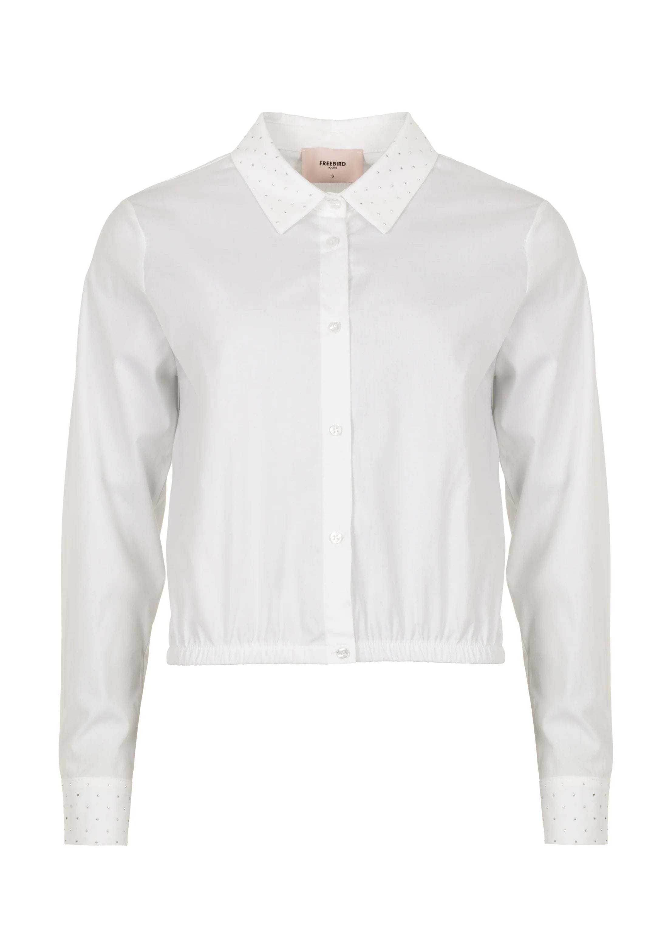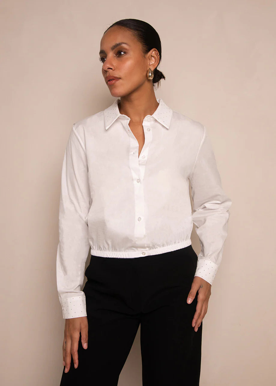 De Breelyn Blouse is een verfijnde klassieker met een moderne twist. Uitgevoerd in een stevige katoen poplin kwaliteit, biedt deze blouse structuur én comfort. De lange mouwen en rechte pasvorm worden geaccentueerd door een elastische tunnel in de taille voor een subtiel getailleerd effect. De strasssteentjes op de kraag en manchetten zorgen voor een sprankelend detail dat een vleugje glamour toevoegt aan deze tijdloze stijl.