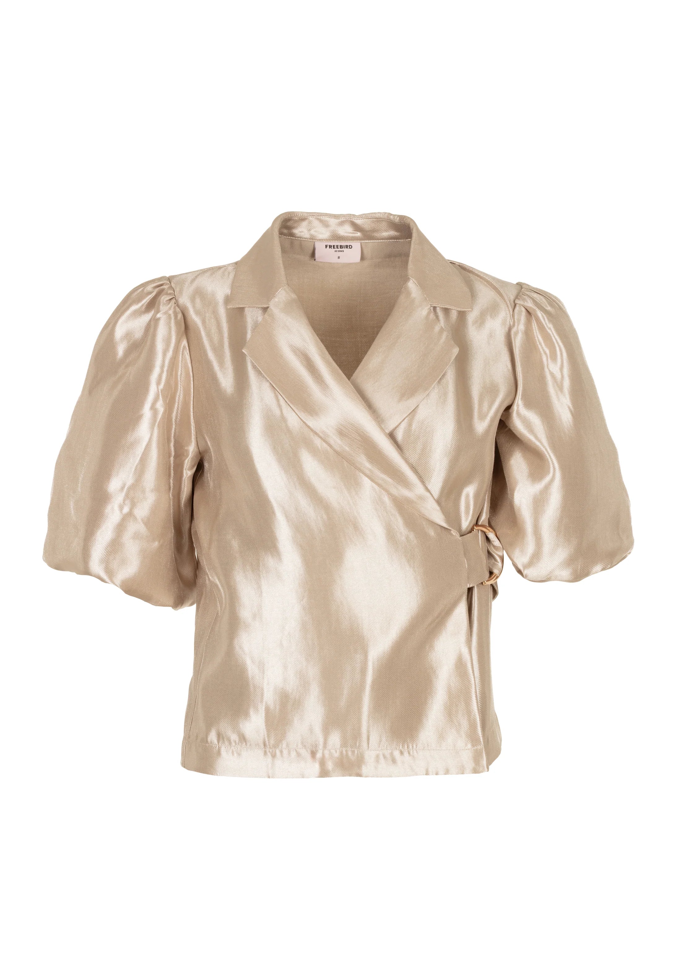 Deze overslagblouse is uitgevoerd in een soepel geweven viscosekwaliteit met een elegante glans. Het vrouwelijke silhouet wordt versterkt door de pofmouwen en het bijpassende ceintuur, waarmee de taille mooi geaccentueerd kan worden. Een verfijnd item dat moeiteloos klasse toevoegt aan elke outfit.