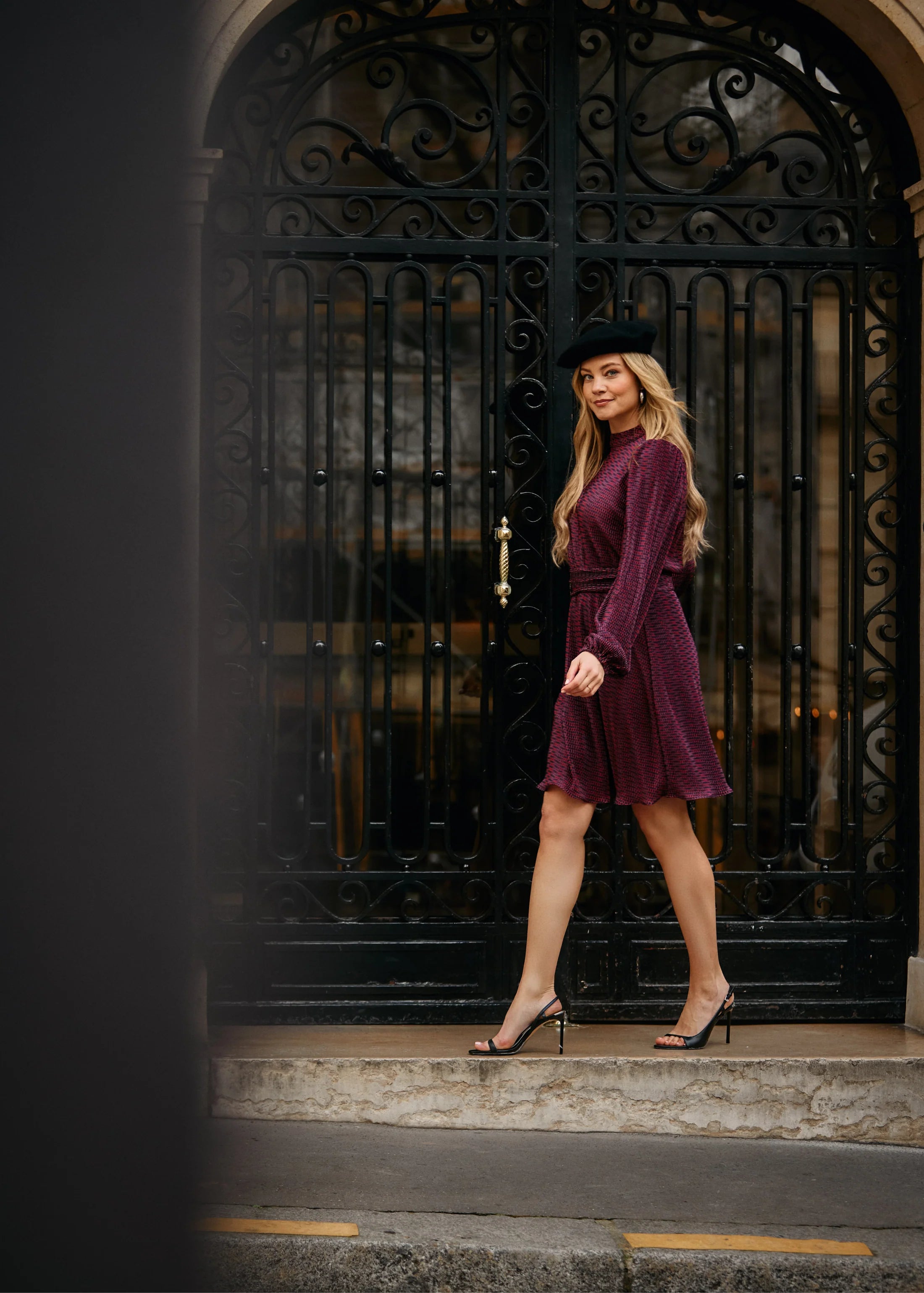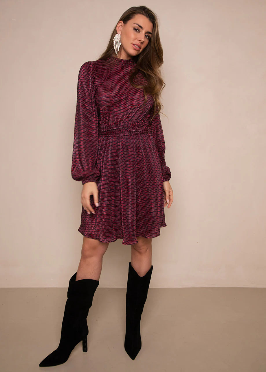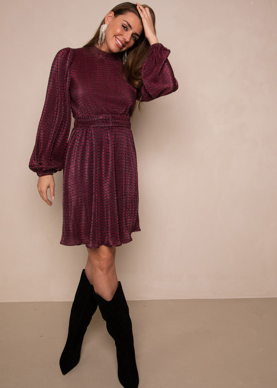 Gemaakt van een luchtige plisséstof met een verfijnde print, straalt de jurk zowel elegantie als comfort uit. Het opstaande kraagje en de lange mouwen geven het ontwerp een klassieke touch, terwijl de taille mooi geaccentueerd wordt voor een flatterend silhouet. Perfect voor zowel overdag als een avondje uit.