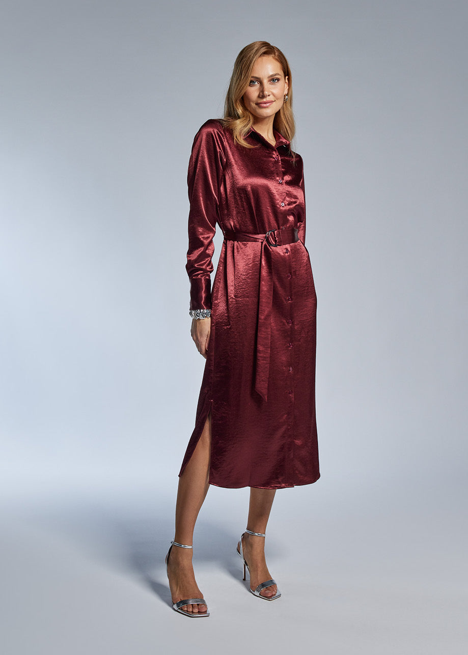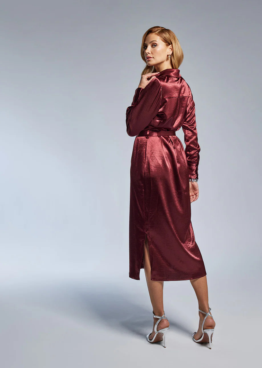 De jurk is gemaakt van een woven kwaliteit met een mooie, subtiele glans die direct voor een luxe uitstraling zorgt. Het lange silhouet is afgewerkt met knopen over de gehele lengte en voorzien van splitten aan de zijkanten voor extra bewegingsvrijheid. De strikceintuur in de taille benadrukt het vrouwelijke silhouet en kan naar wens worden aangepast voor de perfecte fit. Ideaal voor zowel een chique diner als een stijlvolle daglook.