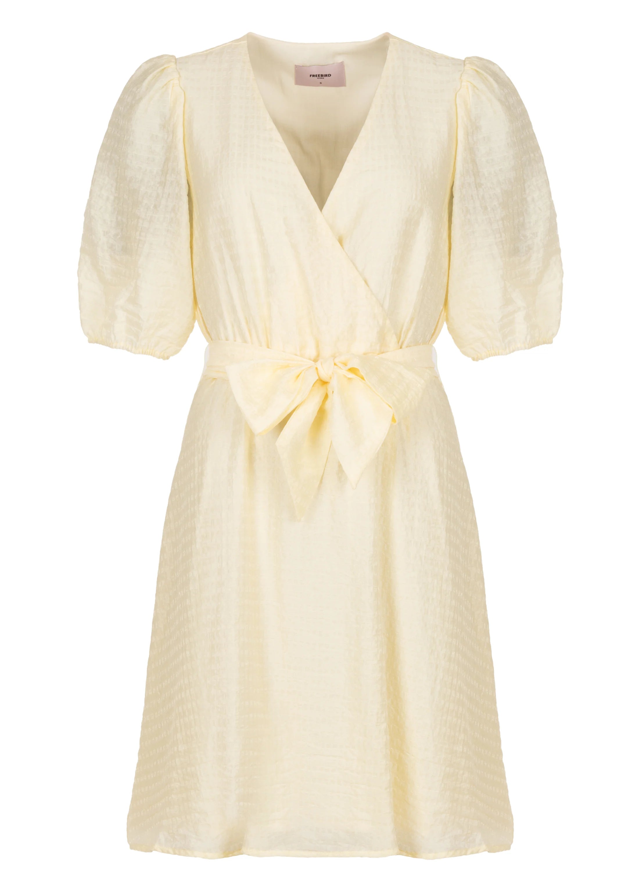 Deze jurk is gemaakt van een soft woven structured kwaliteit, waardoor het materiaal subtiele textuur en een verfijnde glans heeft. De V-hals zorgt voor een flatterende, vrouwelijke uitstraling, terwijl de elastieken tailleband het silhouet mooi vormgeeft zonder in te leveren op comfort.