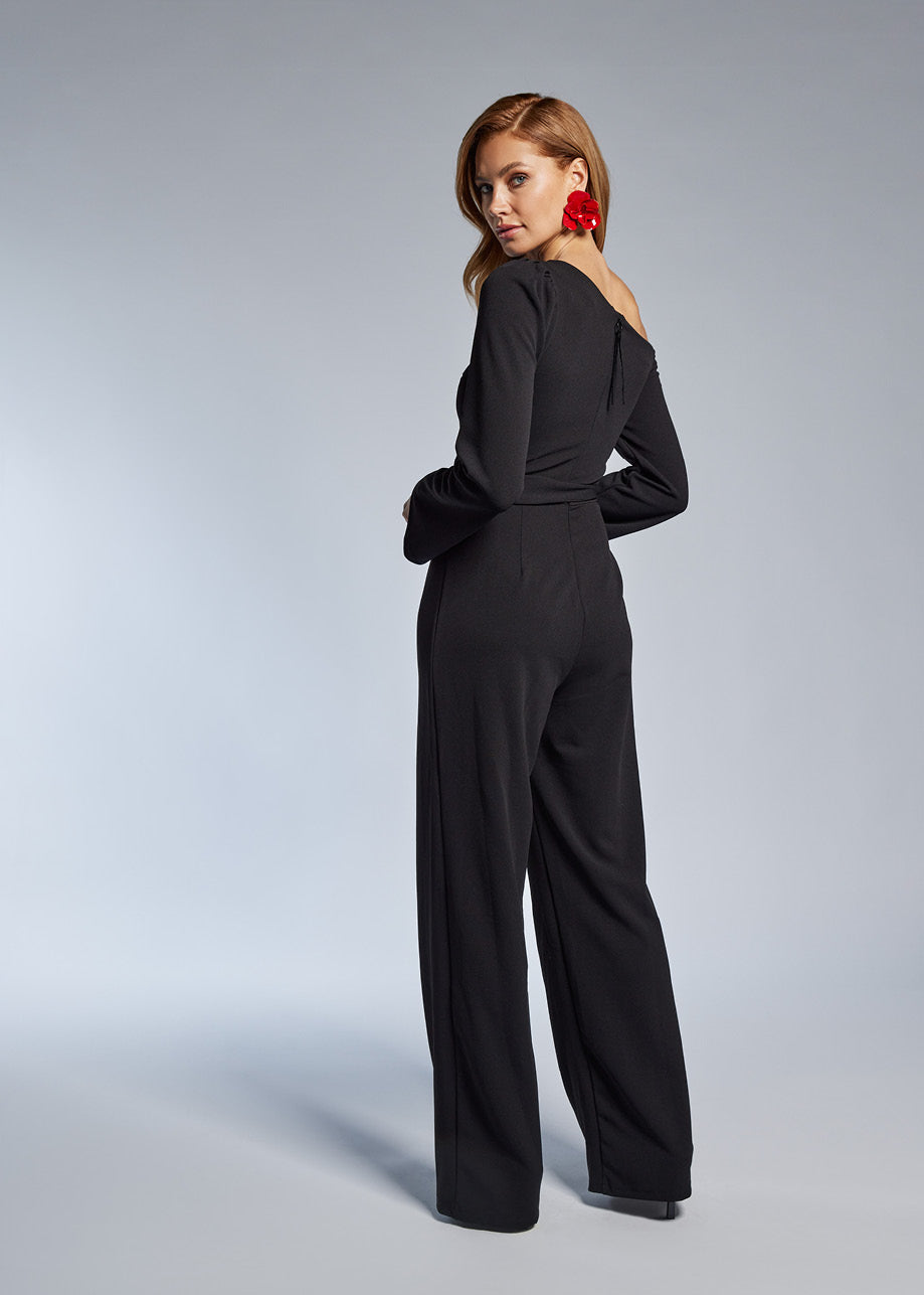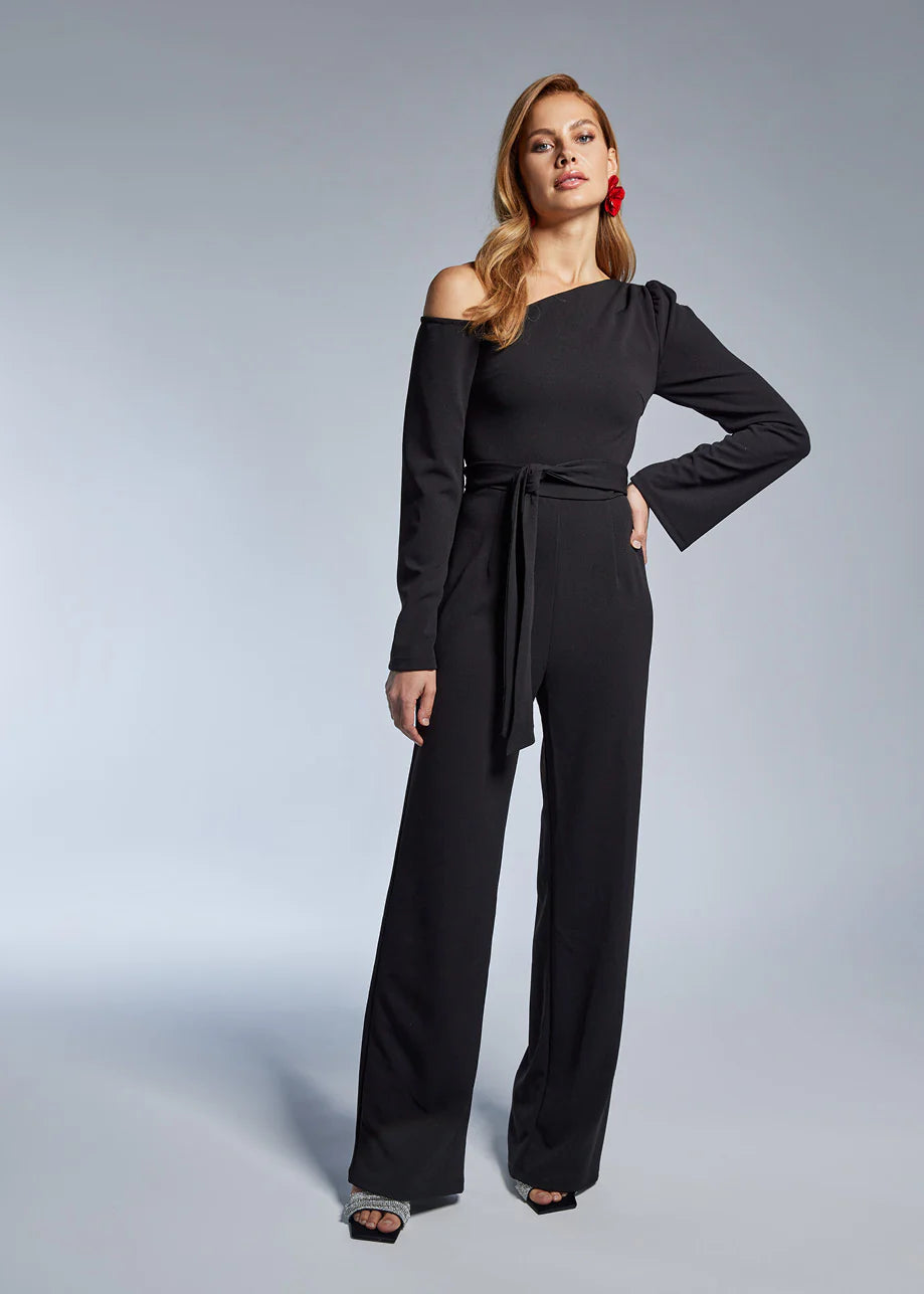 De jumpsuit is gemaakt van een comfortabele crêpe jersey kwaliteit met stretch, waardoor hij soepel valt en een flatterende pasvorm heeft. De asymmetrische schouderlijn geeft het ontwerp een moderne en stijlvolle uitstraling. De tailleband die je zelf kunt strikken accentueert de taille en zorgt voor een vrouwelijk silhouet. Perfect voor zowel een diner als een feestelijke gelegenheid.