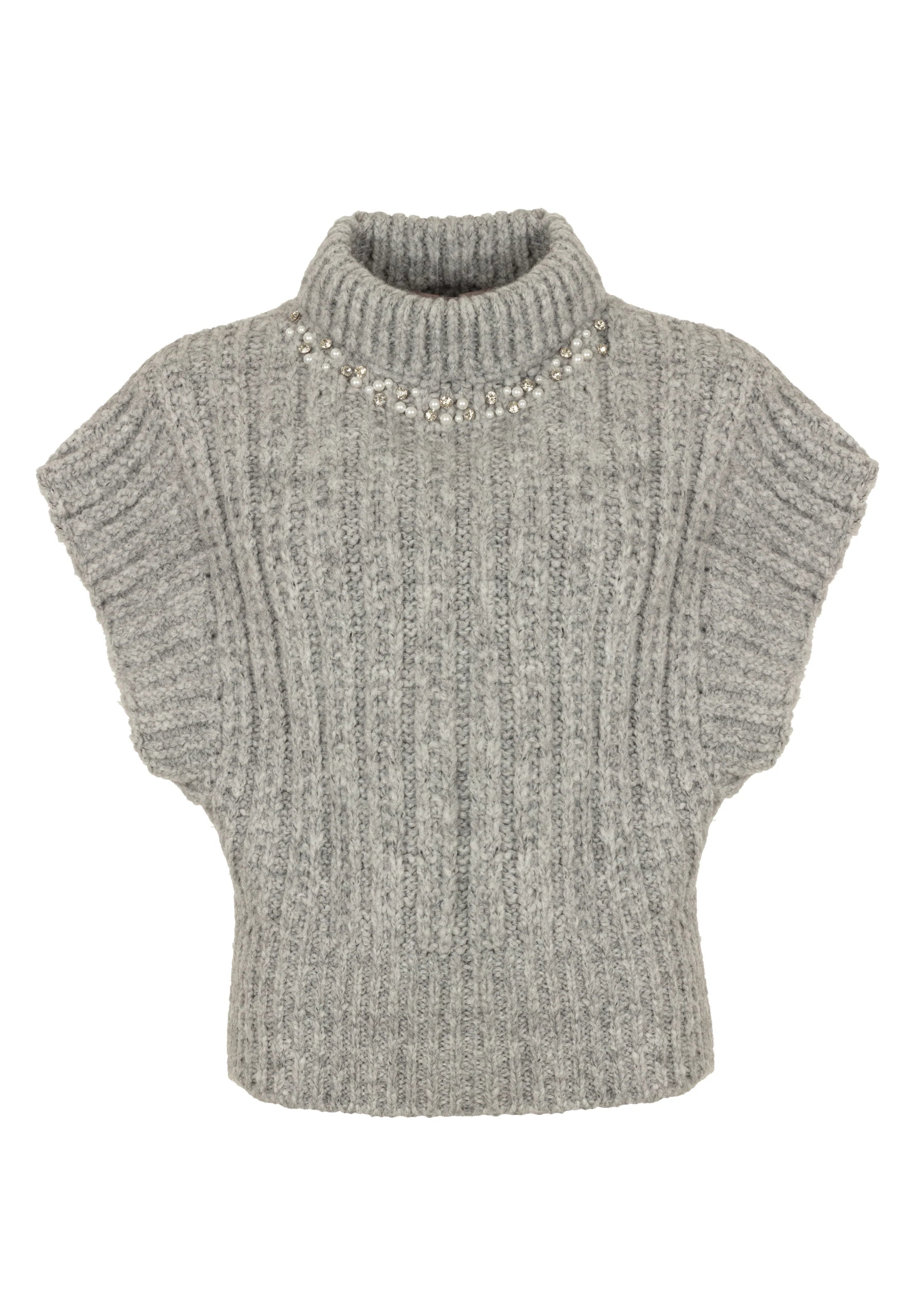 De Kalista Spencer is een eigentijdse, mouwloze knit die moeiteloos stijl en comfort combineert. Gemaakt van een zachte, hairy garenmix, voelt deze spencer warm en luxueus aan. De parel- en steendecoratie langs de halslijn voegt een verfijnde, vrouwelijke touch toe aan het grovere breisel. De hoge col en geribde structuur zorgen voor een moderne, ingetogen look.