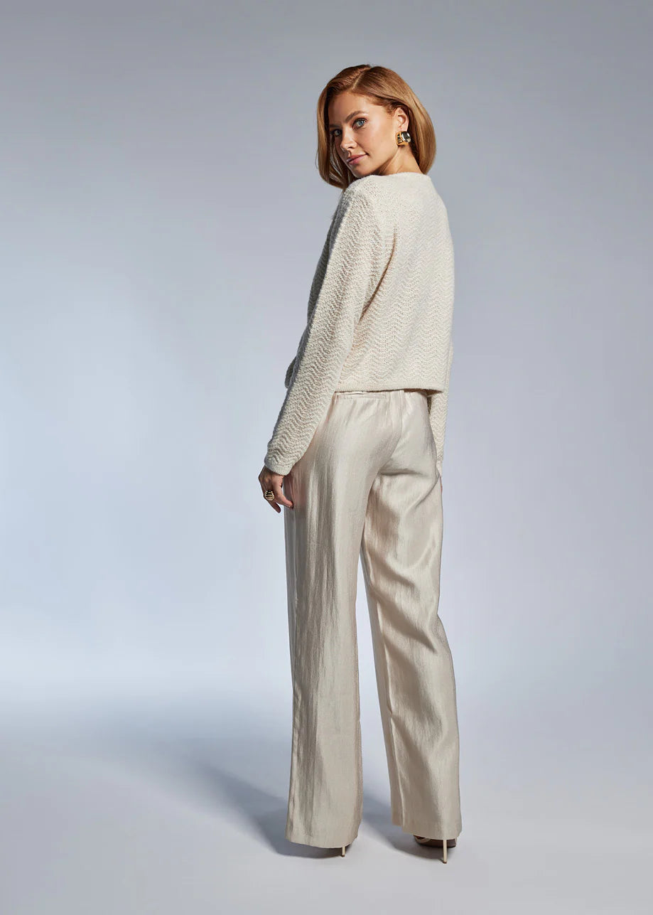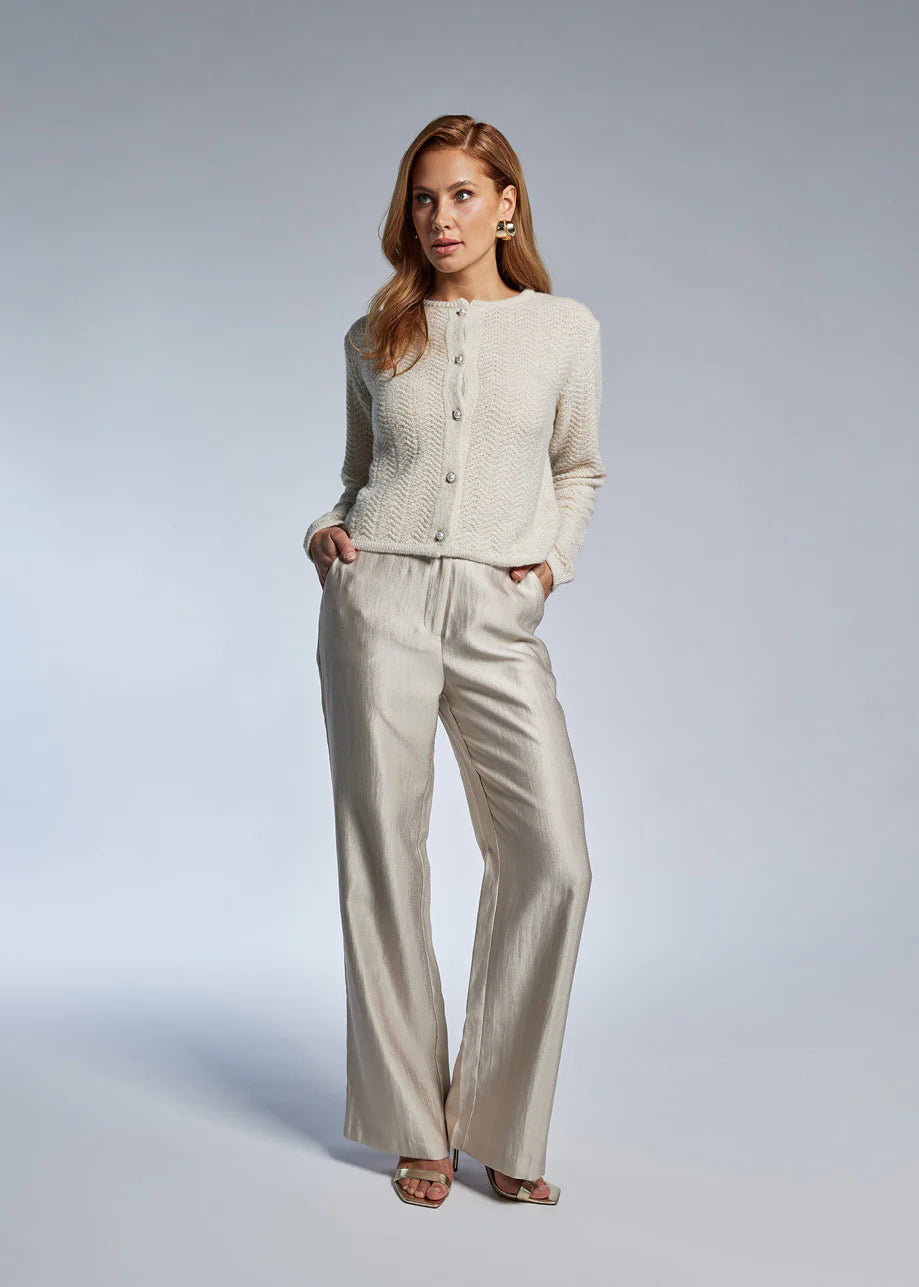 Dit gebreide vest is vervaardigd uit een zachte garenmix met subtiele lurex, wat zorgt voor een vleugje glans en een luxueuze uitstraling. Het ontwerp heeft een ronde hals, lange mouwen en is afgewerkt met verfijnde knopen die het geheel een vrouwelijke en stijlvolle touch geven. Perfect te dragen over een blouse of jurk voor een elegante, gelaagde look.