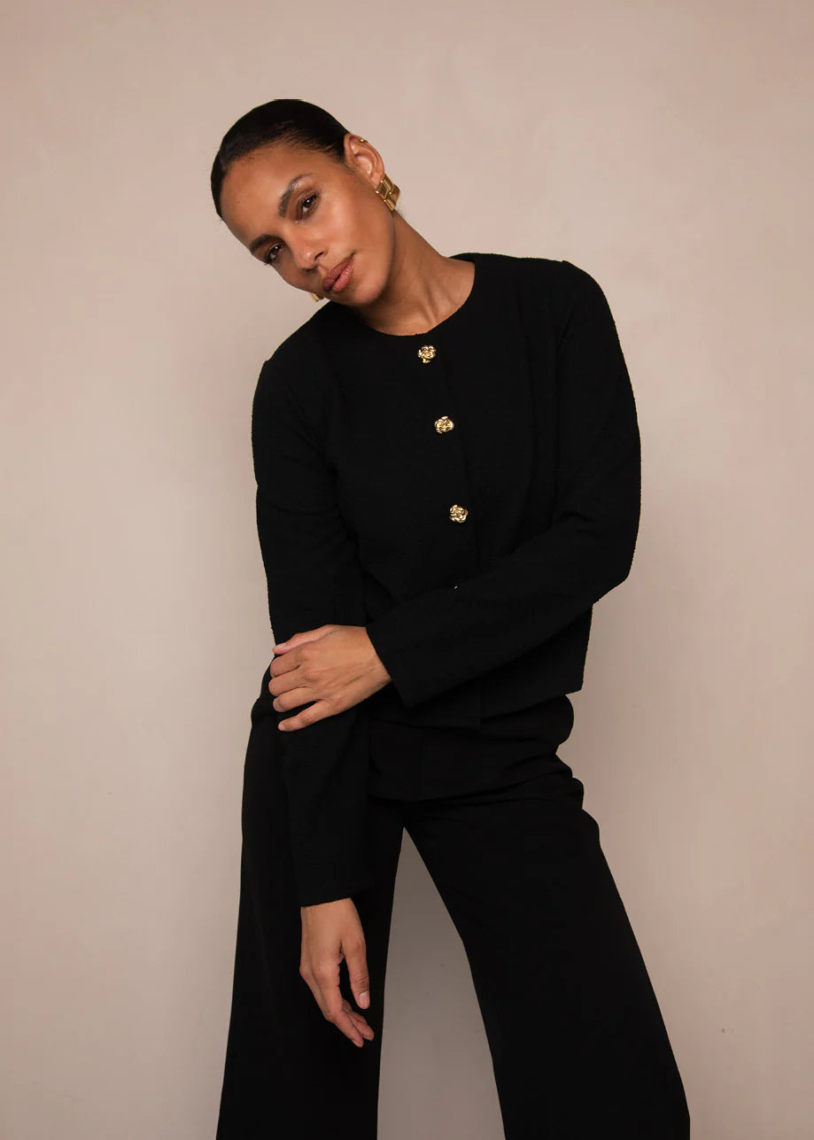 De Liselotte Jacket is een tijdloos jasje met een chique uitstraling. Gemaakt van een comfortabele jerseykwaliteit met een subtiele boucléstructuur, combineert dit item moeiteloos stijl en draagcomfort. De klassieke ronde hals en lange mouwen worden aangevuld met een opvallende knoopsluiting met luxe sierknopen, die zorgen voor een verfijnde, vrouwelijke finish.