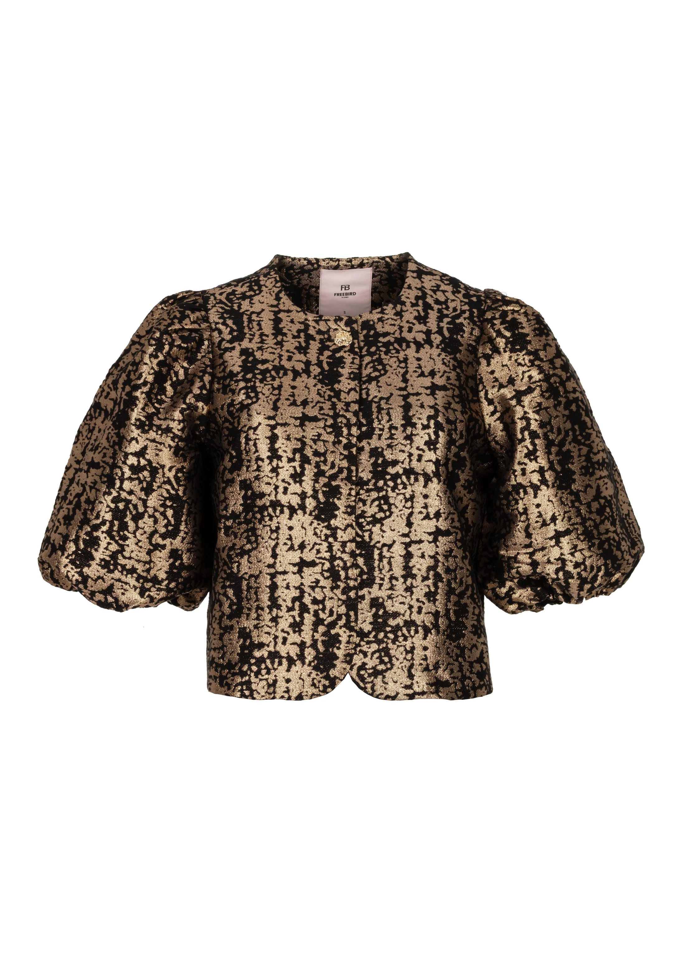 Het jasje is gemaakt van een rijke woven jacquard kwaliteit met een subtiele metallic glans die zorgt voor een chique en moderne look. De korte ballonmouwen voegen een speels en vrouwelijk accent toe, terwijl de rechte pasvorm zorgt voor een tijdloze balans. Perfect om je outfit een stijlvolle upgrade te geven – of je het nu combineert met een jurk of een pantalon.