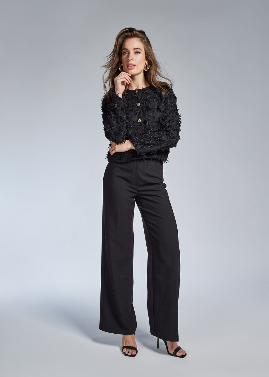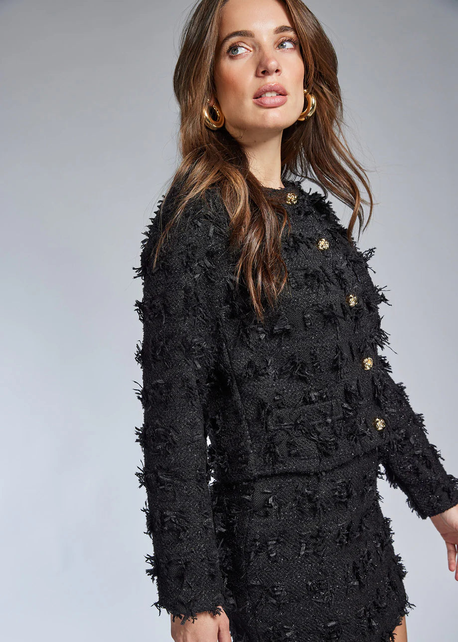 Het jasje is gemaakt van een verfijnde woven bouclé kwaliteit met een subtiel harig effect en glinsterende lurexdraden, wat zorgt voor een rijke en elegante look. De klassieke knoopsluiting en rechte pasvorm geven het ontwerp een stijlvolle, vrouwelijke uitstraling. Perfect te combineren met een pantalon of jurk voor een chique, moderne outfit.