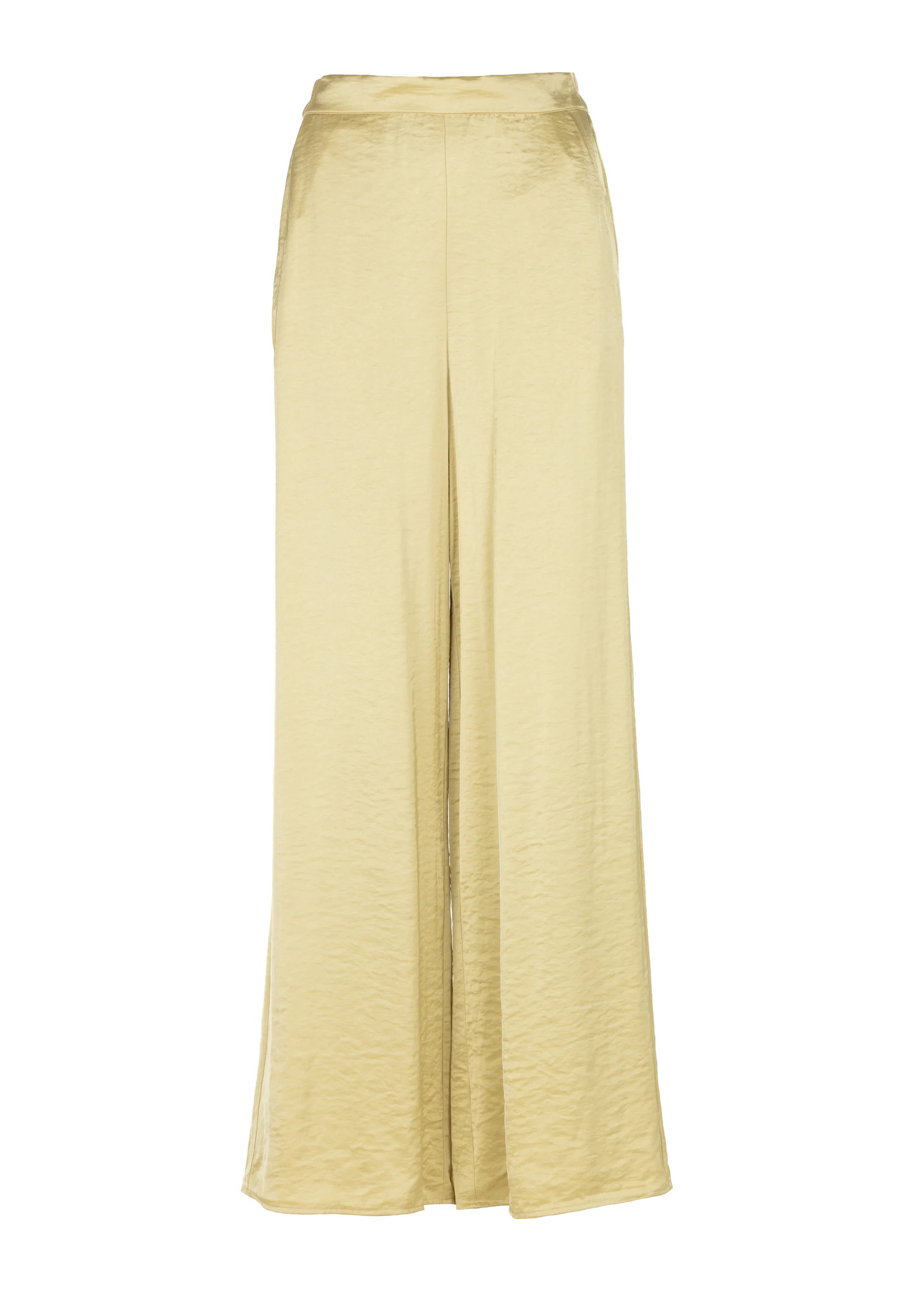 Deze pantalon is uitgevoerd in een zachte, geweven satijnkwaliteit met een verfijnde glans. De wijde pijpen zorgen voor een elegante en vloeiende look, terwijl de elastische tailleband aan de achterzijde extra comfort en bewegingsvrijheid biedt. Een stijlvol item dat moeiteloos chic en draagcomfort combineert.